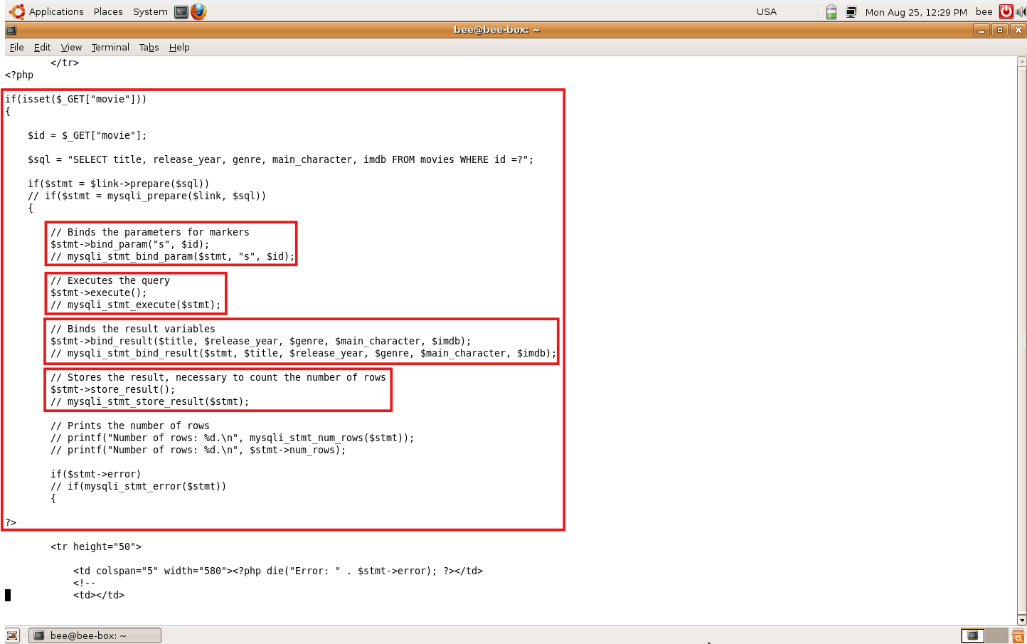 비박스 가상환경에서 /var/www/bWAPP/sqli_2-ps.php 의 소스코드를 확인한다.