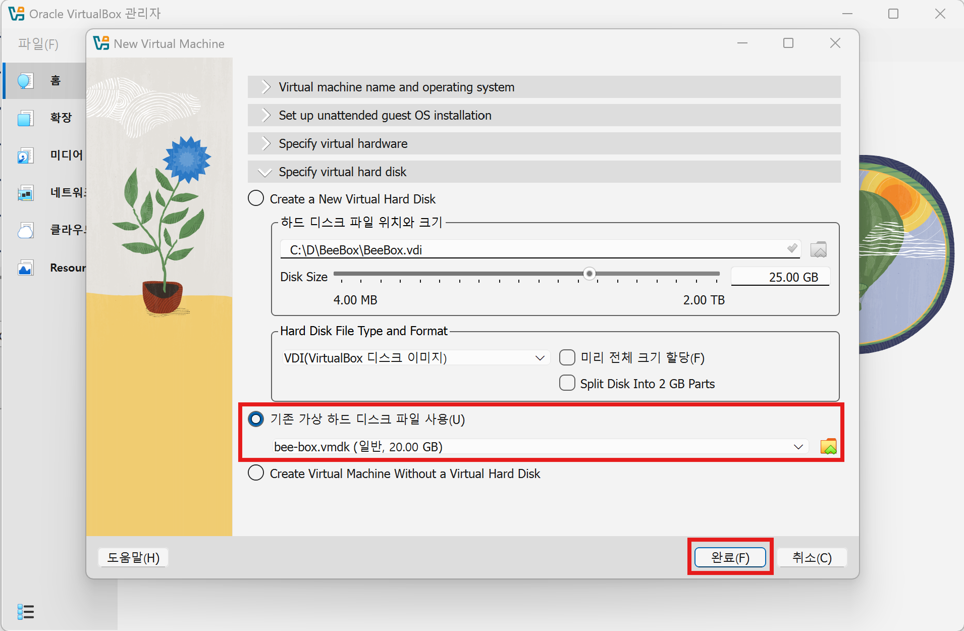 아래 하드디스크 부분을 클릭하고 기존 가상 하드 디스크 파일 사용을 누른다.