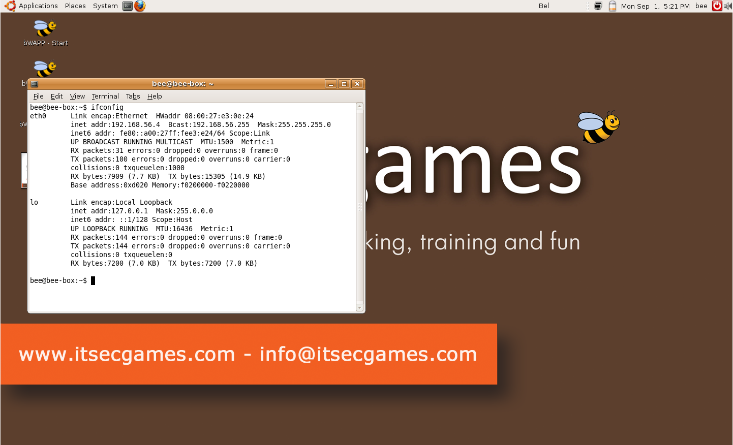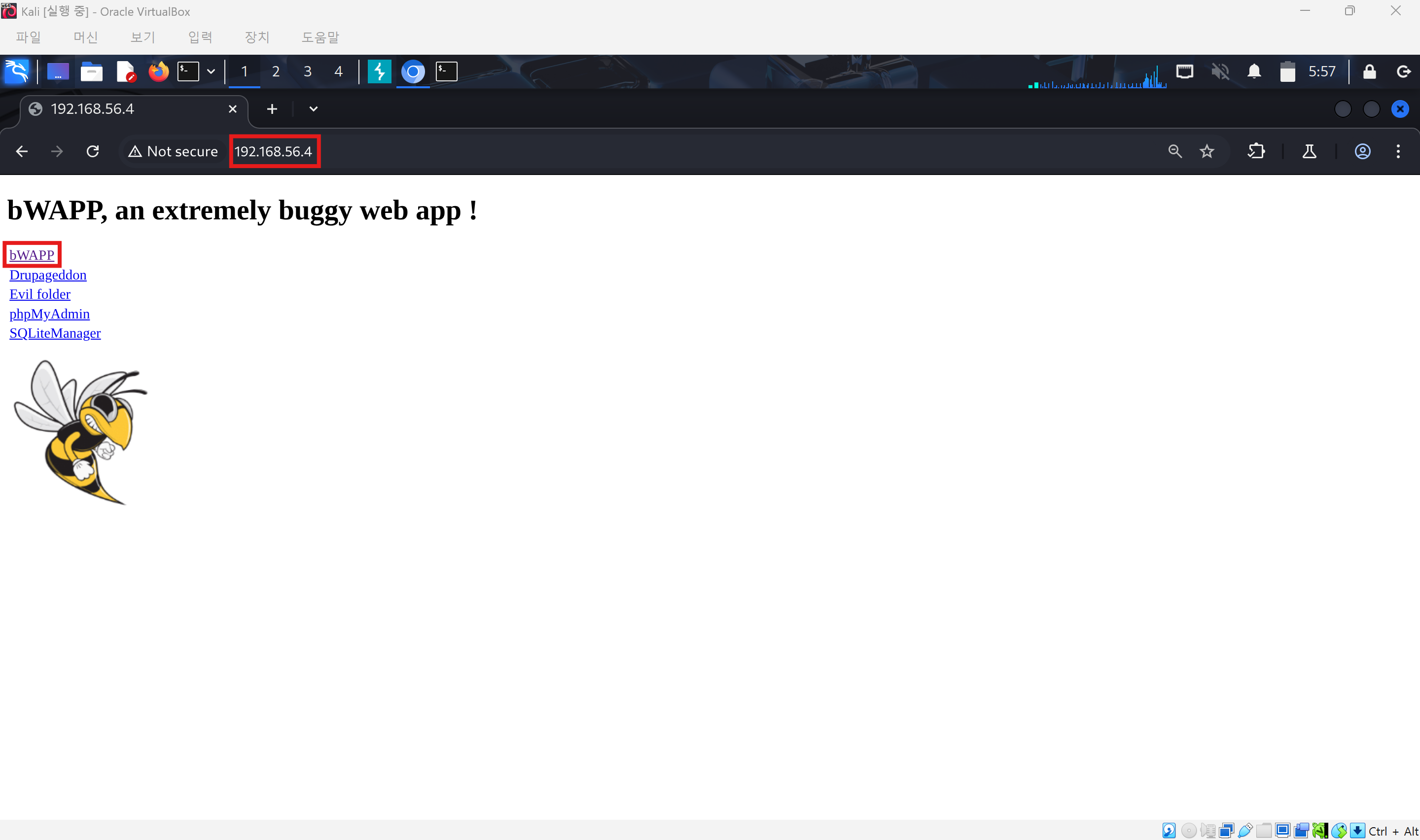 4. 비박스 가상환경에서 ifconfig로 확인한 IP주소로 접속하면 bWAPP 홈페이지에 접속할 수 있다.