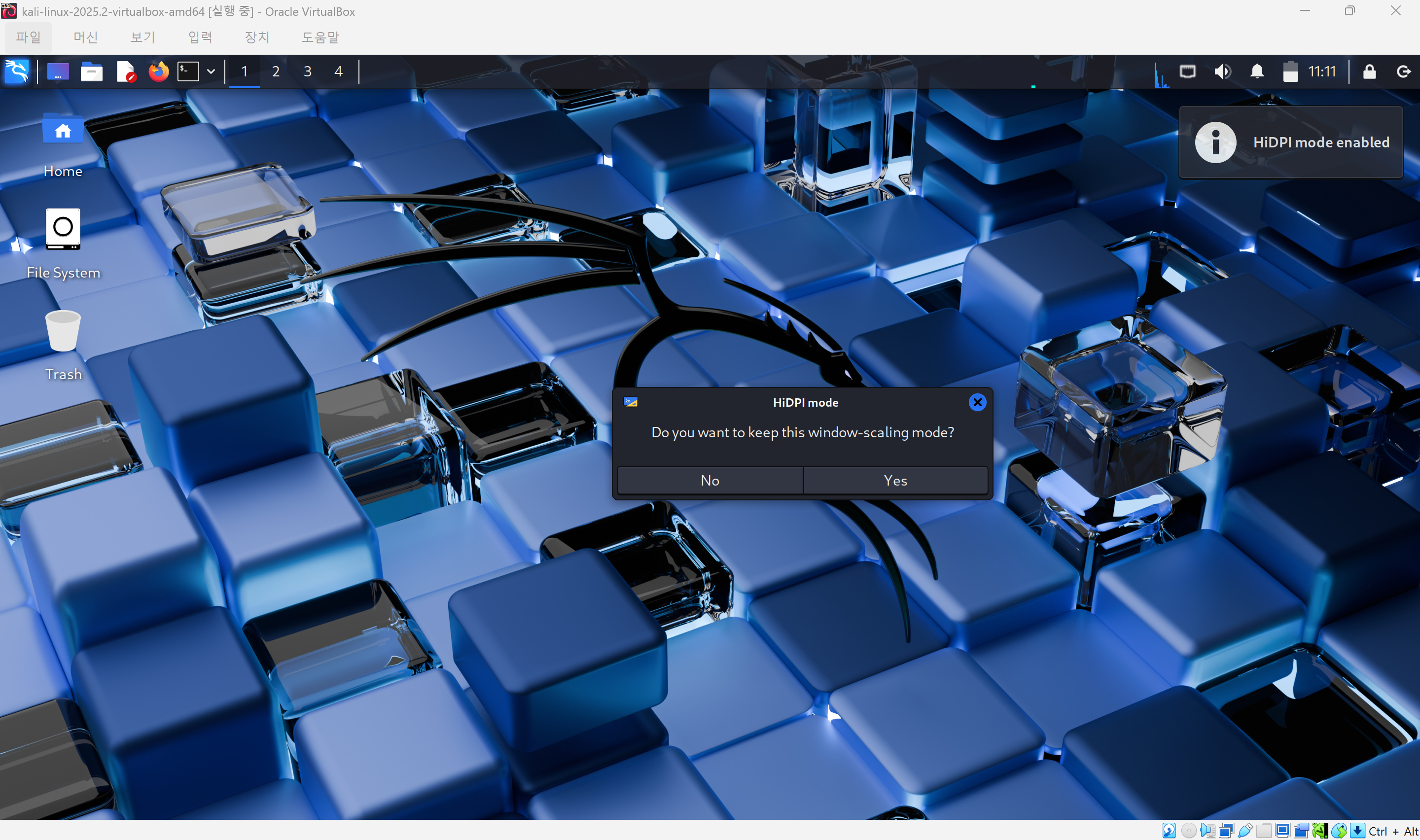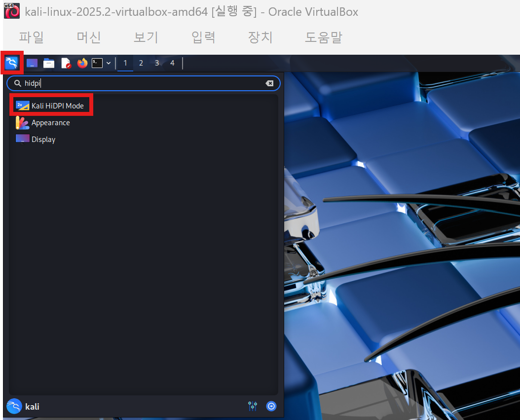 칼리 리눅스의 상단바 및 아이콘, 글씨 등이 매우 작다.