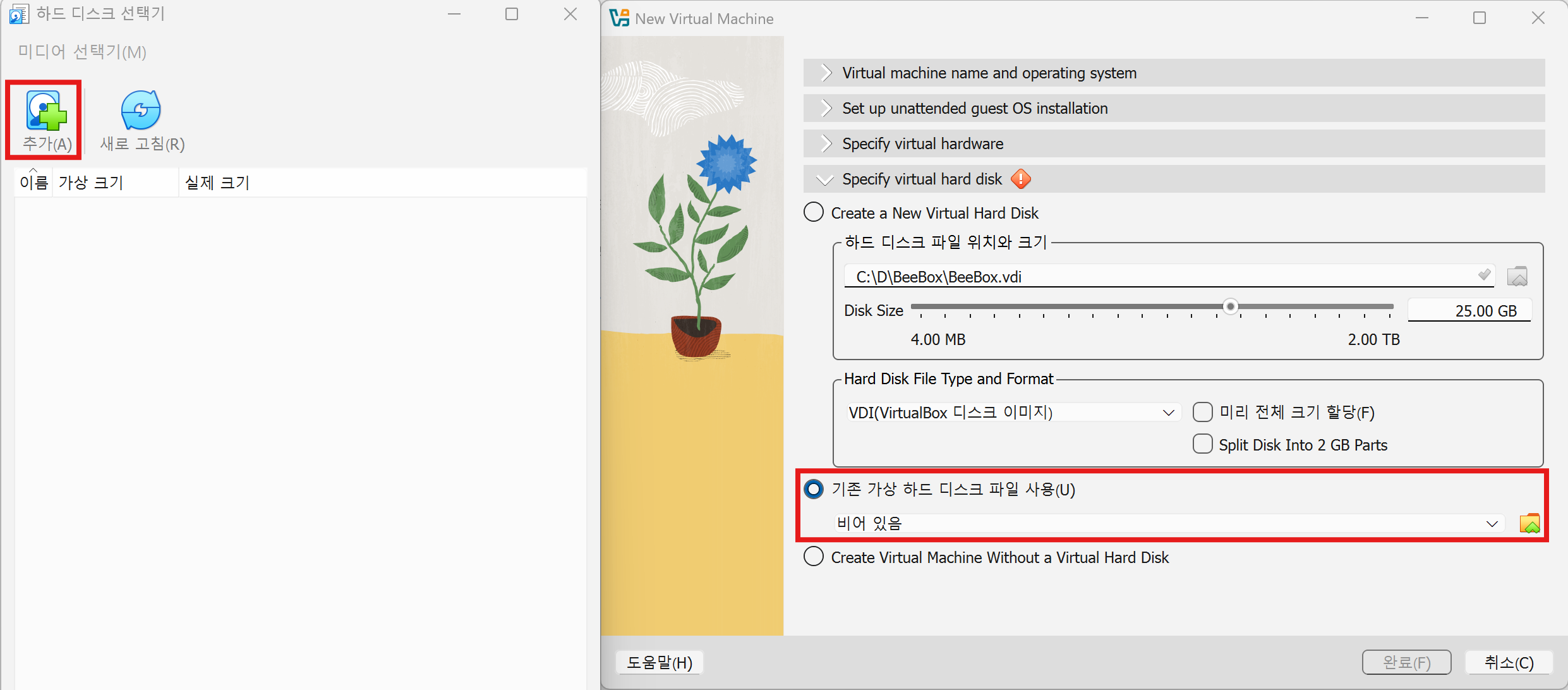그리고 버추얼박스에서 추가해야 한다. (새로만들기x)