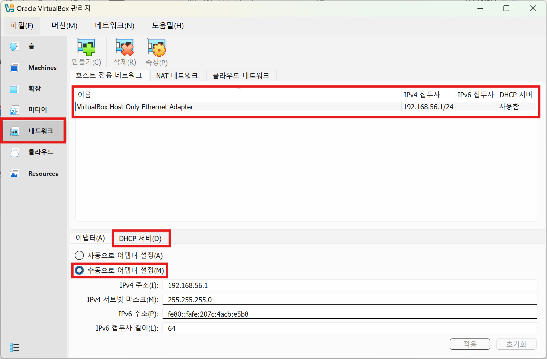 먼저 네트워크 설정에서 이렇게 설정한다. IP주소는 상관없다. DHCP 서버도 들어가서 켜준다.