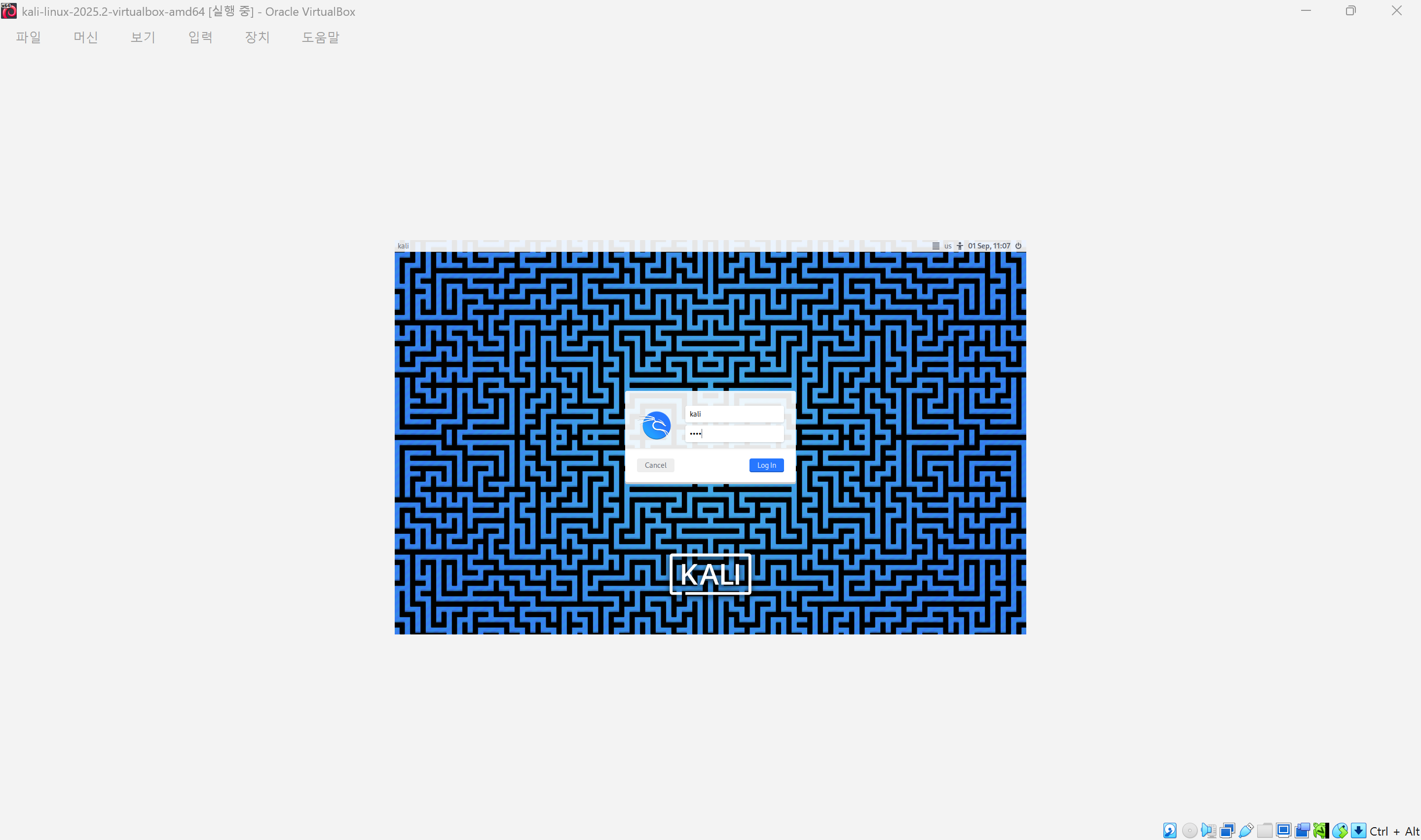 초기 아이디/비밀번호는 kali/kali 이다.