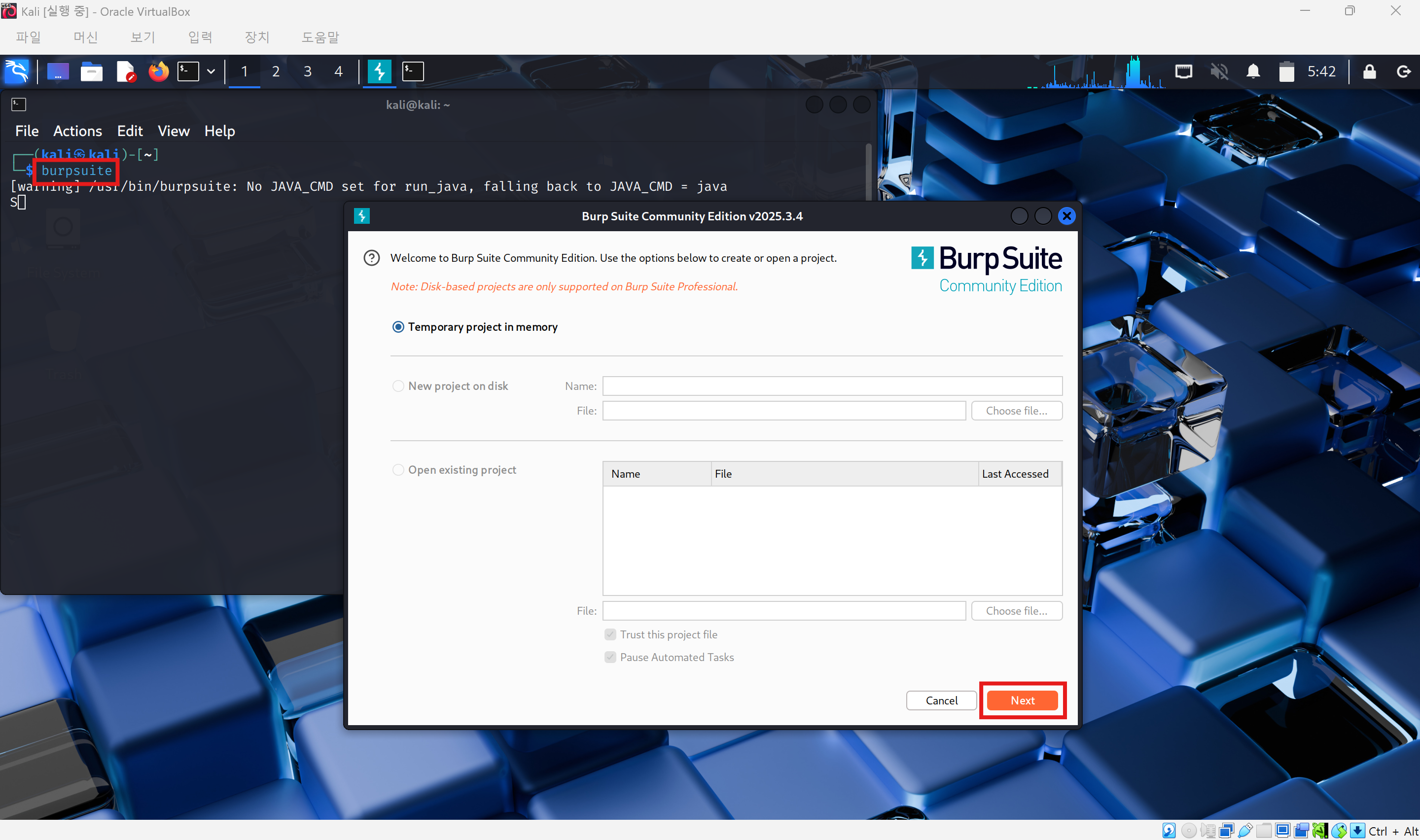 2. 칼리 리눅스 터미널에서 burpsuite 명령으로 버프스위트에 접속한다. 창이 뜨면 계속 주황색 버튼을 누르면 된다.