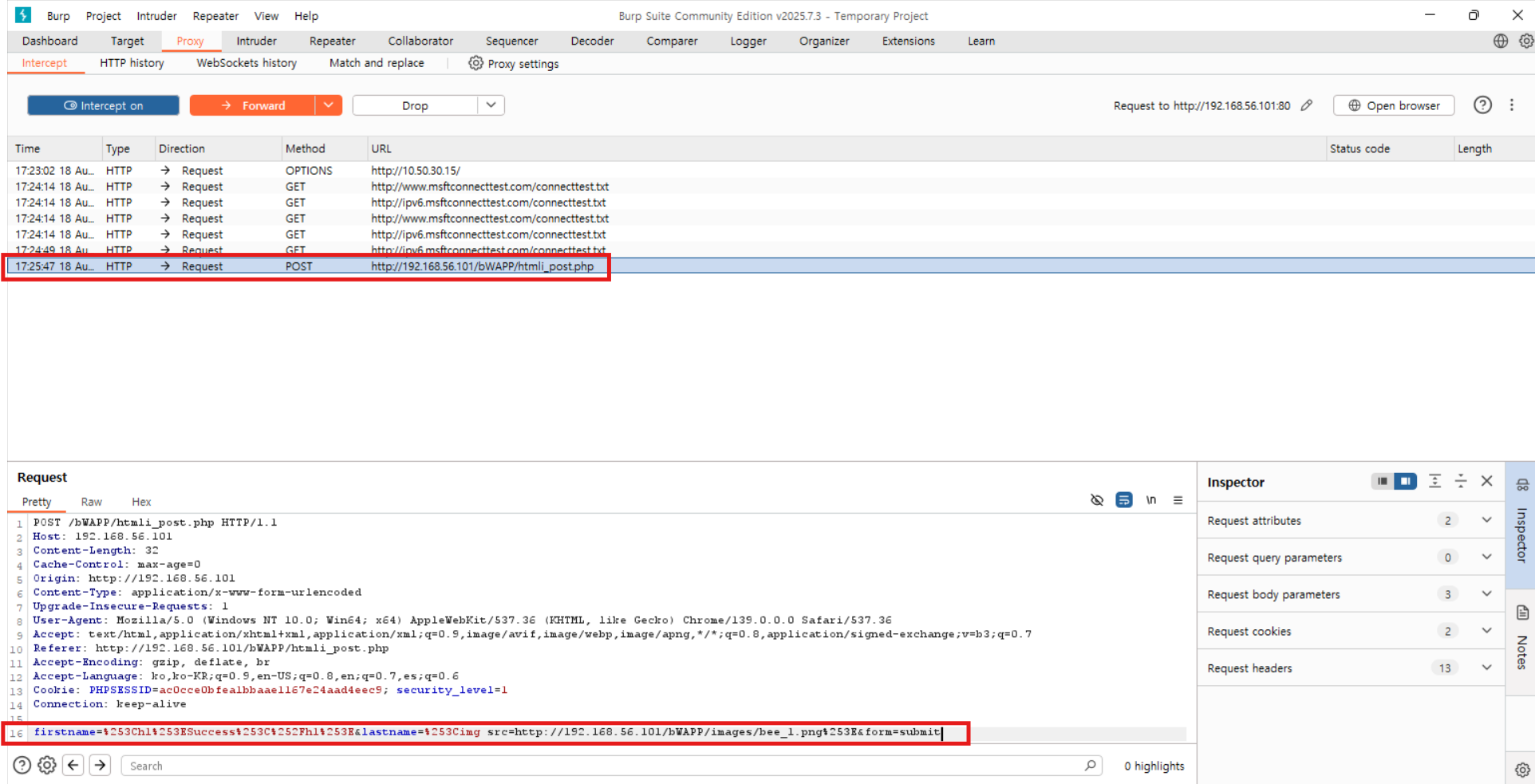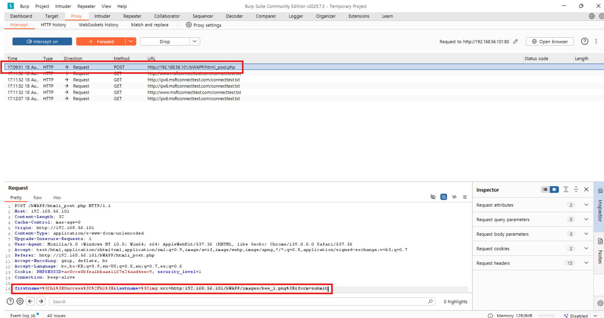 lastname= %253Cimg src=http://192.168.56.101/bWAPP/images/bee_1.png%253E