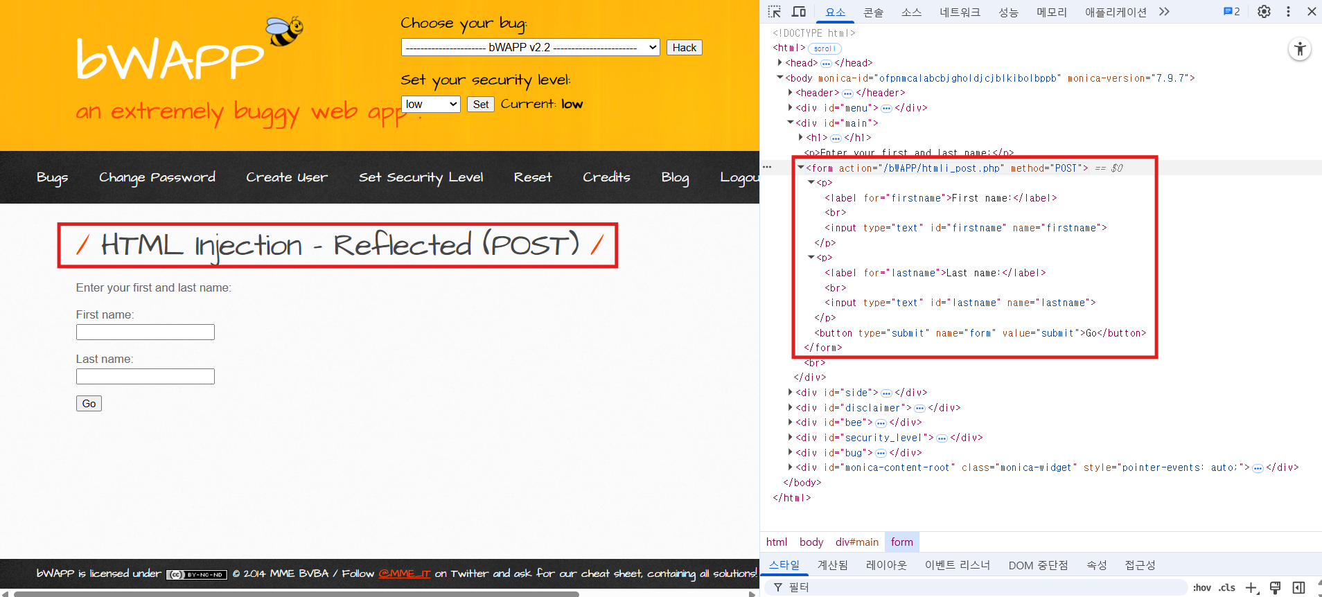 htmli_post.php 페이지의 형식을 사용하기 위해서 Reflected(POST) 페이지로 이동하여 개발자 도구(F12)를 키고 HTML 소스 코드를 복사한다.