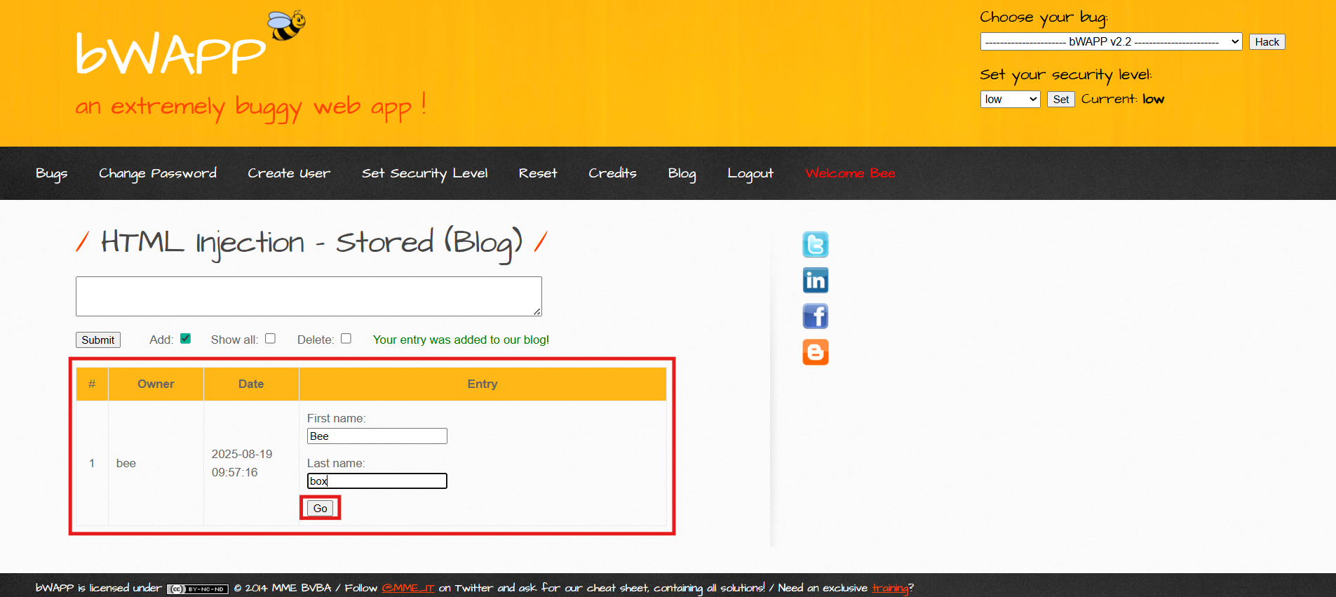 HTML Injection - Stored (Blog) 공격 설명: HTML 태그를 블로그 형식의 페이지에 저장하여 관리자가 의도하지 않은 내용을 출력 혹은 권한 없이 우회하여 다른 페이지로 이동하는 공격.